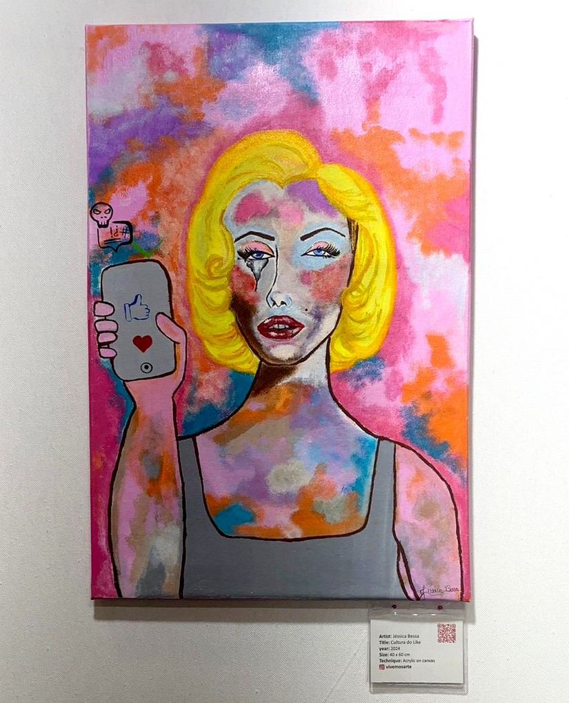 “Fiz uma crítica a esse ambiente onde as pessoas estão sempre buscando fazer essa pegada por curtidas, por like, sempre deixando de aproveitar momentos e até mesmo usando filtros e sempre voltadas para agradar. Por isso a lágrima no rosto na imagem que pintei na tela. É também uma crítica aos haters”, relatou.
