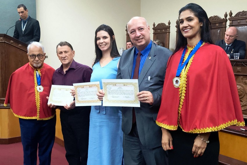 Na foto acima: Novo acadêmico Dr. Hélio Mario de Arruda (desembargador aposentado), homenageados Luis Claudio Coan, Dra. Mayara Moreira Campos Silva Brandão, Dr. Waldyr Loureiro e a nova acadêmica Dra. Vanessa Franklin (advogada atuante).