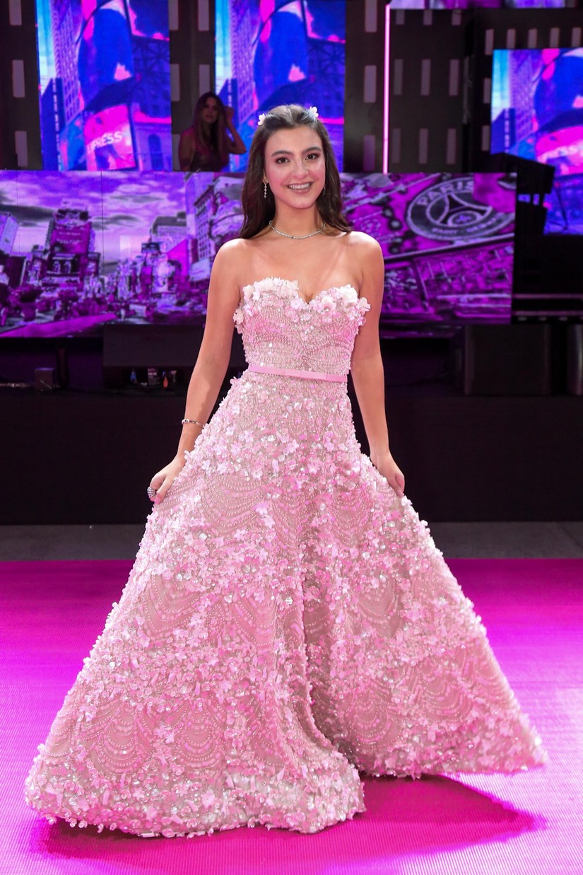 No início da noite, a aniversariante usou um vestido longo rosa, com base de tafetá. O trabalho artesanal era impressionante. Foram mais de 200 horas de bordado manual, aplicações de pérolas, flores, miçangas e paetês. O resultado foi descrito pela estilista como uma “obra de arte” que combinava delicadeza e imponência. Um espetáculo.