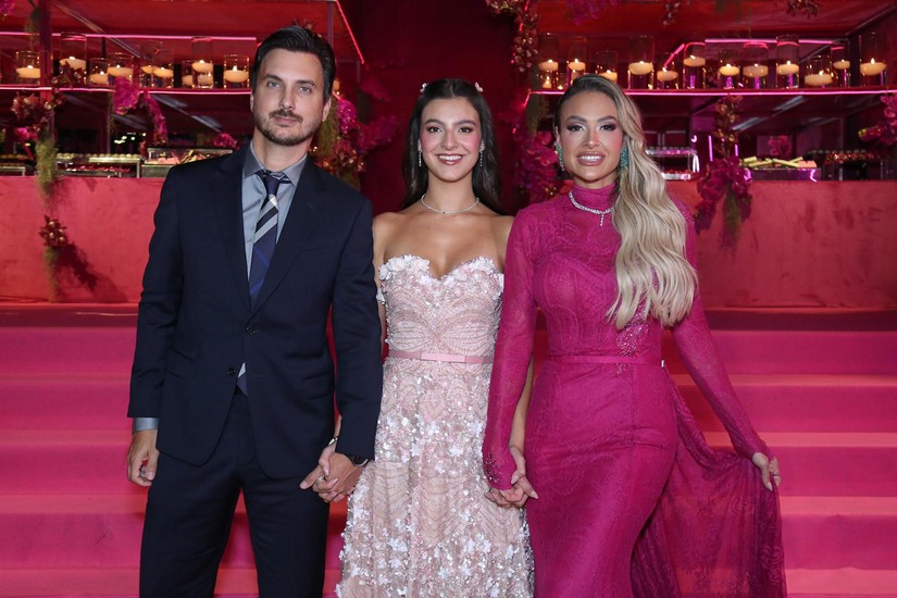 Antonela recebeu os convidados ao lado da mãe, Nathalia Braga, do pai Alexandre Mol e do irmão Davi Braga.