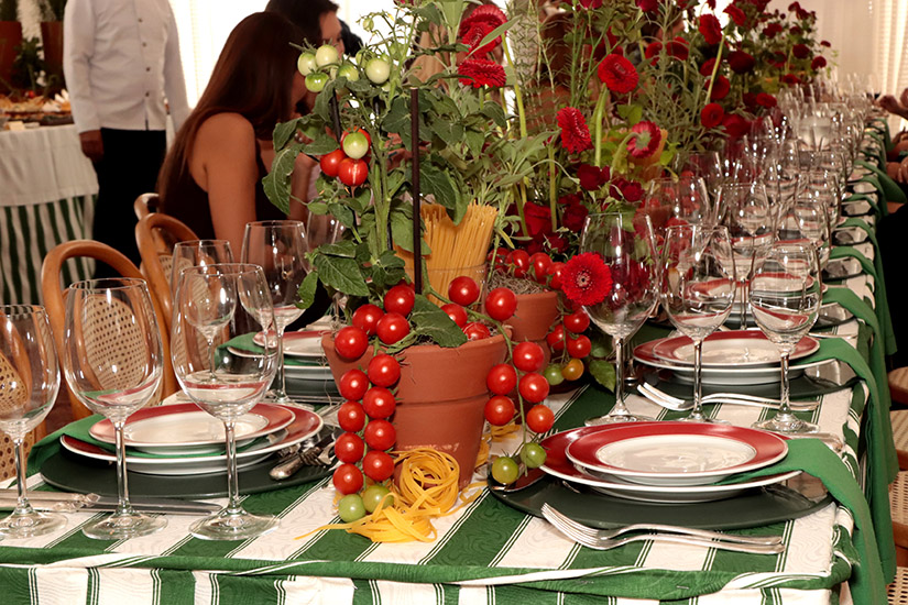 Seguindo a temática escolhida por Mara, que é uma verdadeira apaixonada pela Itália, o almoço, é claro, com buffet italiano, foi do Buffet Nossa Casa, harmonizado com os vinhos da Vinícola Barbara Eliodora. Já a decoração foi de Thita Marcon e os doces da Lamego.