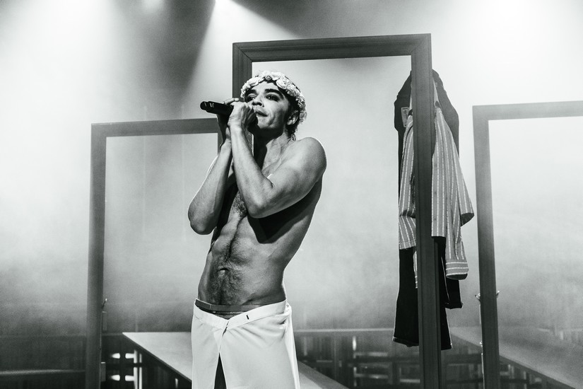 Quanto à encenação, as diretoras apostam em um ensemble potente, que apoia o protagonista do começo ao fim – e praticamente sem sair de cena. As trocas de figurinos e até maquiagens, inclusive, são feitas na frente do público, brincando com as ideias de oculto e explícito o tempo todo.