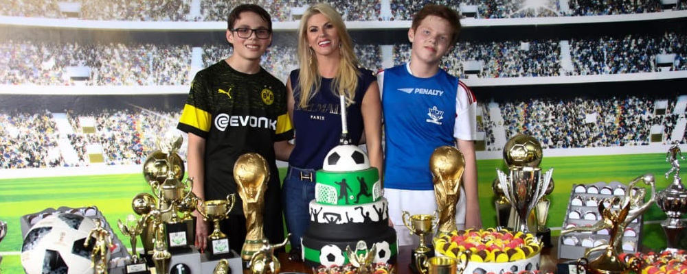 Val Marchiori comemorou com os filhos, neste sábado, o aniversário de 13 anos dos seus filhos gêmeos, Victor e Eike. Como a paixão deles é futebol, ela preparou uma festa diferente, em um campo de futebol.