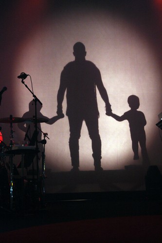 O cenário traz uma tela gigante onde são projetadas sombras com diversas imagens de acordo com as músicas do show.