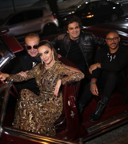 Os bem-humorados João Camargo, Ronaldo Ésper e Pedro Lima ao chegarem no evento fizeram fotos com a anfitriã em um luxuoso carro Lincoln Continental Conversível ano 1967.