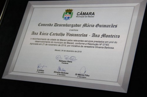 A colunista social Aninha Monteiro – integrante do Jornal Tribuna Independente, da TV Tribuna e de um blog no site Tribuna Hoje e vice-presidente da FEBRACOS (Federação Brasileira dos Colunistas Sociais) – foi a grande homenageada na última quarta, 04/12, pela Câmara Municipal de Maceió. Por indicação da vereadora Silvana Barbosa (PRTB), Aninha recebeu a Comenda Desembargador Mário Guimarães, honraria tida como a mais alta e antiga do Legislativo maceioense. "É um título que, acima de tudo, representa a trajetória de minha vida, pois atribuo aos meus saudosos pais, meus filhos e netos, a todos os colunistas sociais, companheiros de comunicação em geral, aqueles que ao longo desses 23 anos têm nos acompanhado destacando informações valiosas de Alagoas”, disse Aninha.