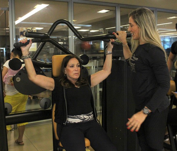 Suzana Vieira foi clicada em uma academia num shopping da zona sul do Rio. A atriz fez primeiro treino aeróbico na esteira com sua personal trainner Ana. Na sequência, um pouco de musculação em outros aparelhos e, para finalizar, com toda sua energia, Suzana fez aula de dança com seu professor Decio.