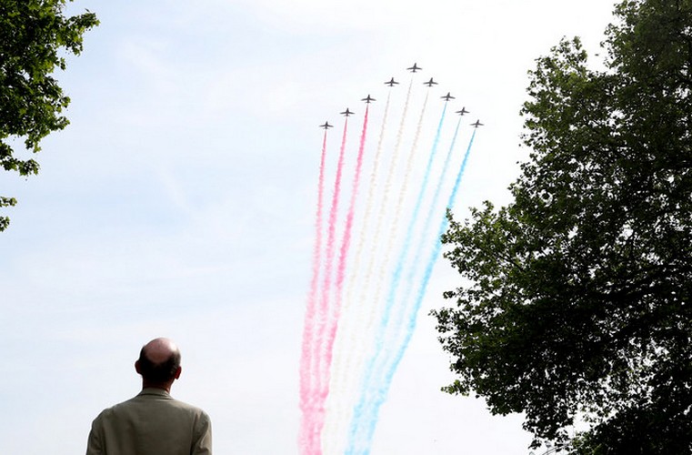 Sobre os céus das principais cidades do Reino Unido, aviões da Royal Air Force assinalaram o aniversário com as cores da bandeira nacional.