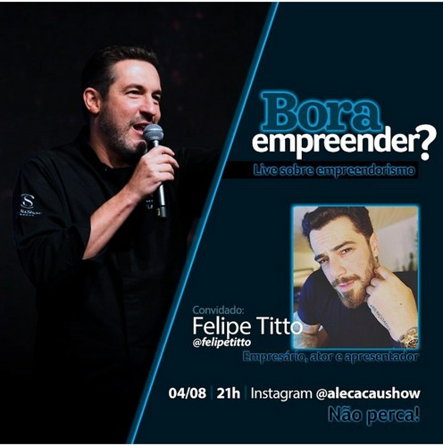 Amanhã à noite, 04/08, a partir das 21 horas, o ator Felipe Titto será o convidado especial da terceira edição da live "Bora empreender?" de Alê Costa, CEO e Fundador da Cacau Show. A conversa acontecerá através do Instagram pessoal de Alê Costa (@alecacaushow).