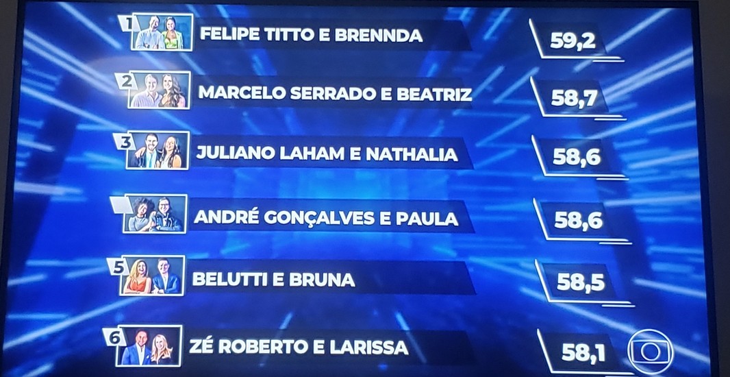 O casal terminou a primeira apresentação da competição na liderança masculina com 59,2 pontos. Seguido de Marcelo Serrado que obteve 58,7 de pontuação.