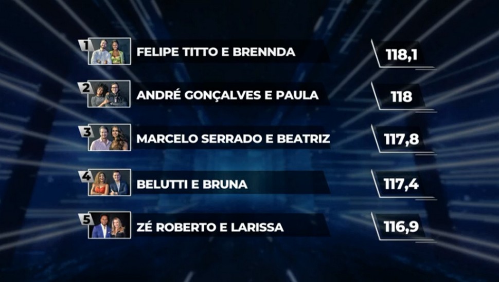A média das notas do público do auditório virtual foi 9,8. Sendo assim, Felipe somou 118,1 pontos, liderando a disputa geral. A líder do time feminino, Danielle Winits, somou 117,9.