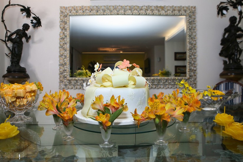 O bolo inspirado no jardim, em harmonia com as cores escolhidas por Krysthel, branca e variações de amarelo, ficou por encargo da grande boleira Dirce Correia. Os maravilhosos "bem- vividos" de Elvira Bona e tâmaras recheadas com pistache por Sarina Nigri.
