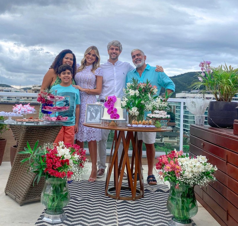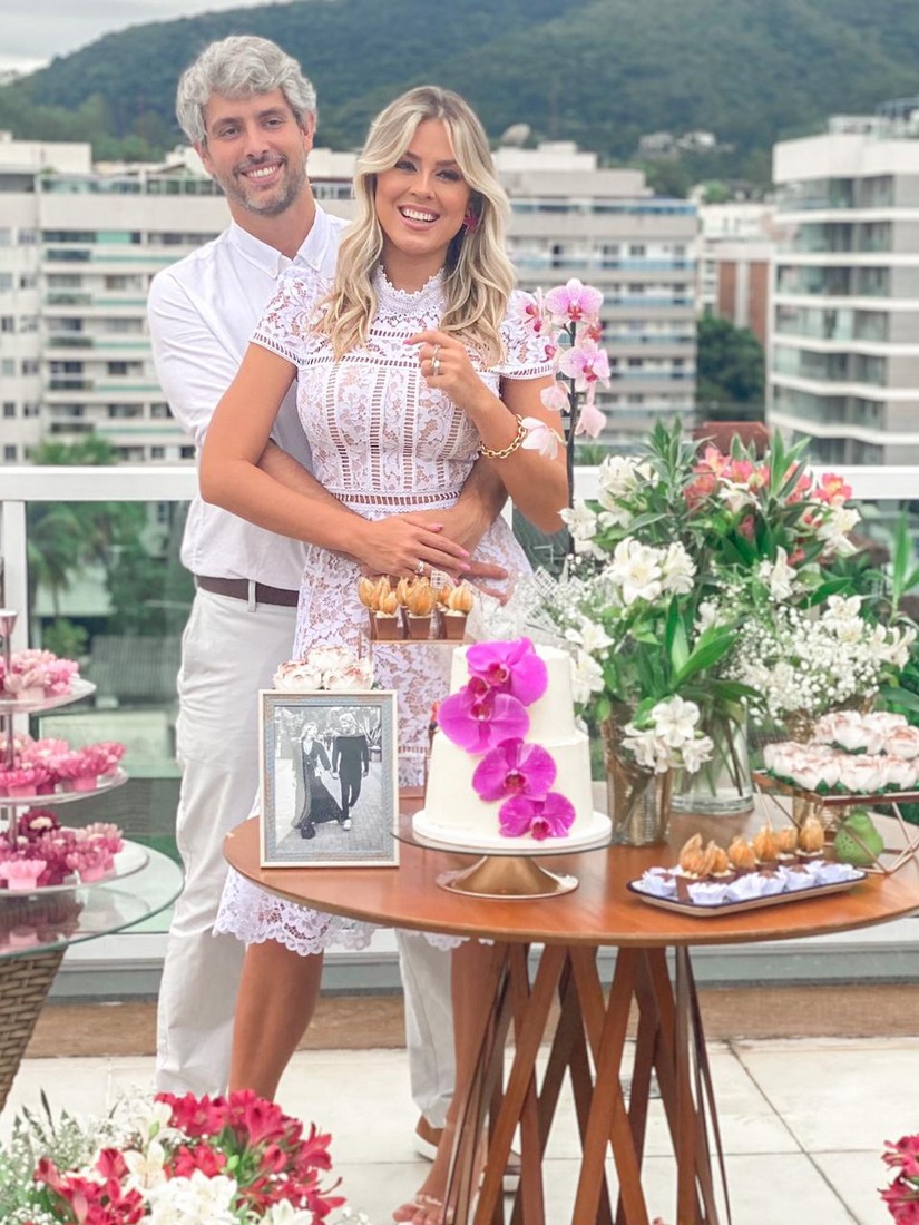 A celebração aconteceu na casa do tio de Pedro. A mãe e irmã dele fizeram surpresa com decoração especial de fotos do casal. Bolo e docinhos foram feitos por Paula, ela irmã do noivo.
