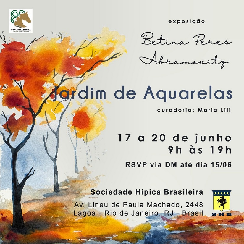 Quem estiver no Rio de Janeiro, poderá conhecer um pouco do seu trabalho ao vivo e a cores. Ela foi convidada para uma exposição paralela, durante a realização da Copa Village Mall de Hipismo, de 17 a 20 de junho deste ano. Betina apresenta no Salão Nobre da Sociedade Hípica Brasileira, a exposição Jardim de Aquarelas com 12 peças, sendo uma aquarela doada para fins beneficentes.