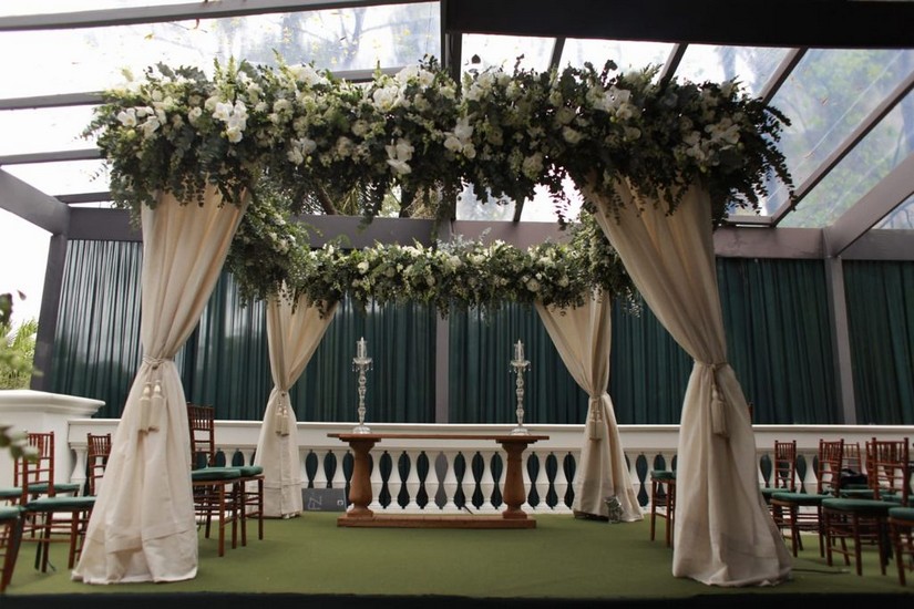 Querem saber? Começarei então com a decoração do local da cerimônia que foi sob o toldo montado na imensa varanda que cerca os salões do Palácio Tangará. Arranjos florais em verde e branco assinados por André Pedrotti com flores da Veilling Holambra. O altar estava deslumbrante! Como se não bastasse, a natureza do Parque Burle Marx, que abraça o magnífico hotel, acaba fazendo parte do layout de qualquer decoração. Nos salões, os imensos arranjos de forma esférica, no mesmo tom de verde e branco e pendurados ao teto, combinavam com os belos arranjos de mesa. Tudo muito luxuoso, muito requintado. E ainda vocês poderão ver nas fotos os imensos arranjos na bela escadaria de chegada.