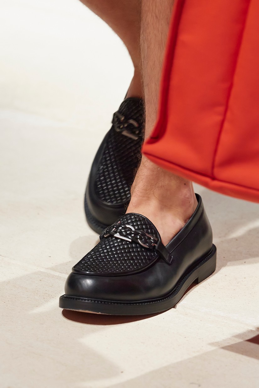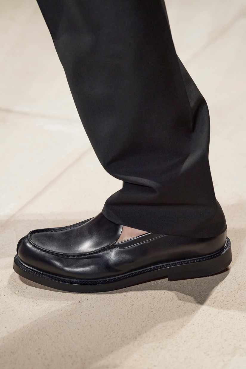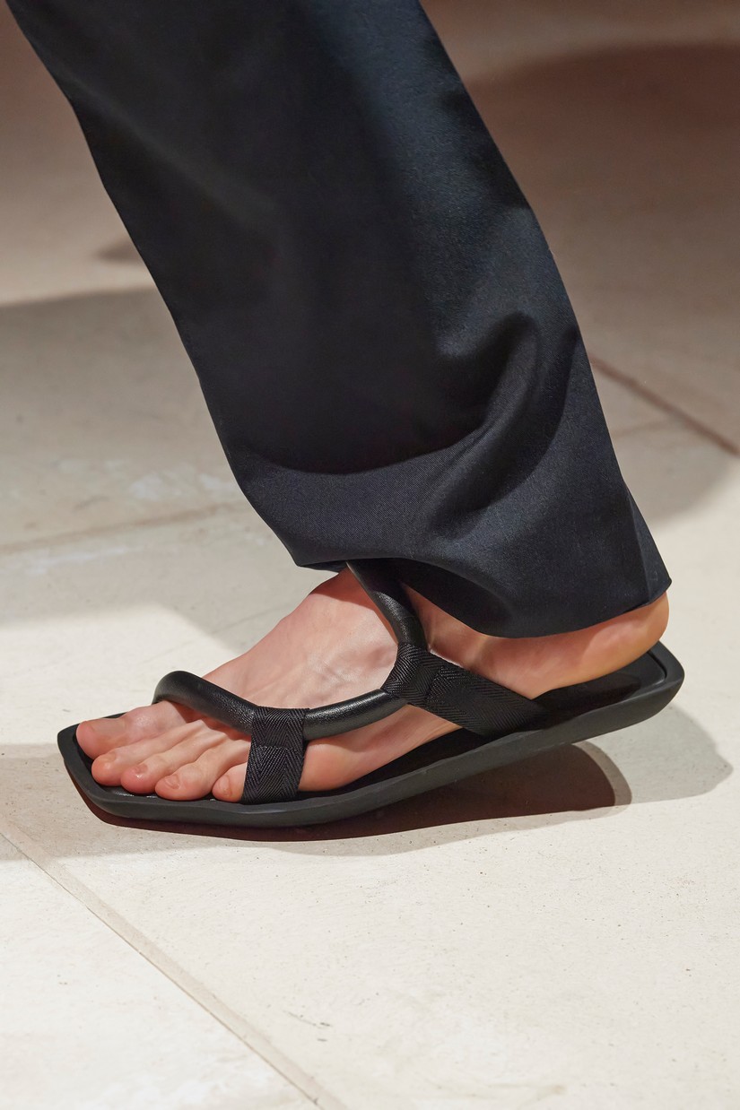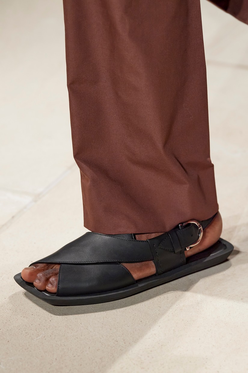 Uma nova sandália masculina é inspirada por um esboço de arquivo Ferragamo de uma forma de sapato com um único desenho arquitectônico, originalmente concebido para as mulheres. A clássica construção de sapatos Tramezza é reinventada através da subtração num mocassim reinterpretado e super macio.