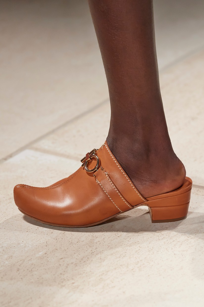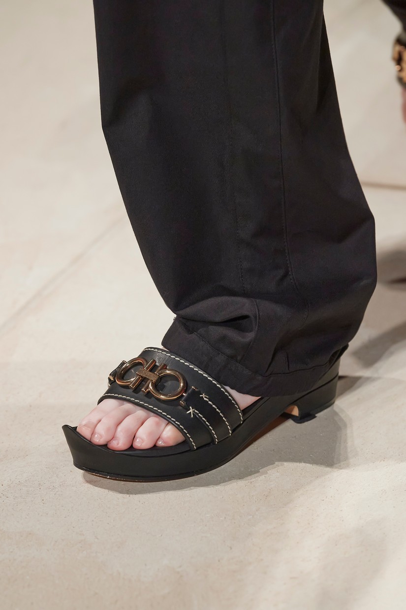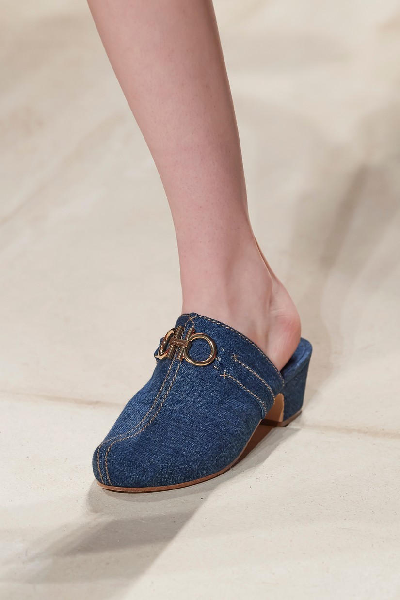 Os ícones Ferragamo, a Vara e a Varina, são reavivados e reimaginados em novas colorações e materiais, incluindo o rattan. Os clogs boêmios - uma mistura entre um tamanco holandês e designs de assinatura da Salvatore Ferragamo de inspiração oriental – com contrastantes lonas e cabedais de couro apresentam o histórico duplo Gancini. A parte superior de tecida à mão em mules flats e elevadas, recorda o design 'Invisibile' da Ferragamo – estas partes superiores de croché são combinadas com palmilhas e calcanhar ornamentados também à mão.