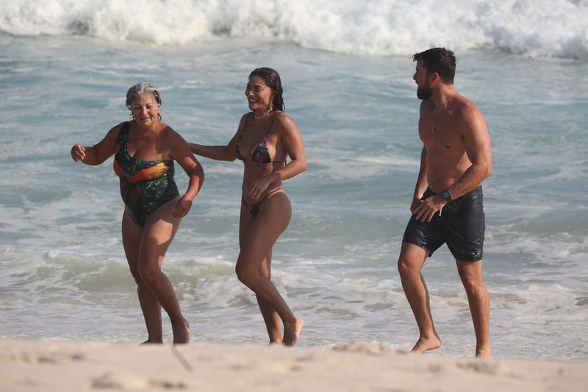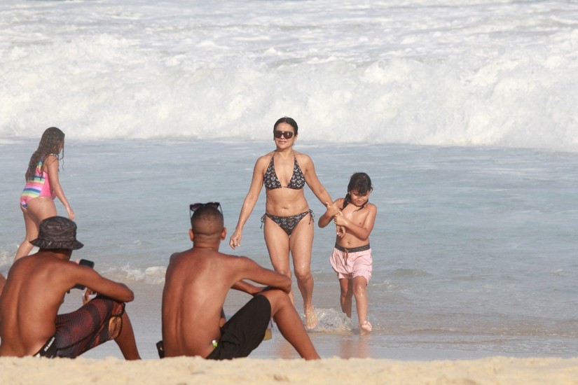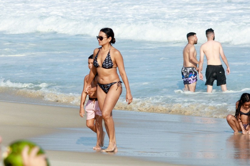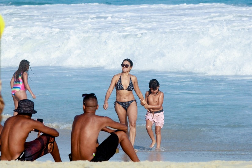 Já em Ipanema, na zona sul, Dira Paes e o filho aproveitaram para dar um mergulho e se refrescarem do calor de 40 graus.
