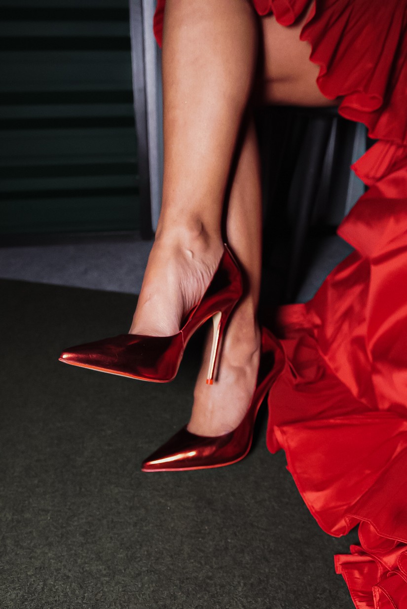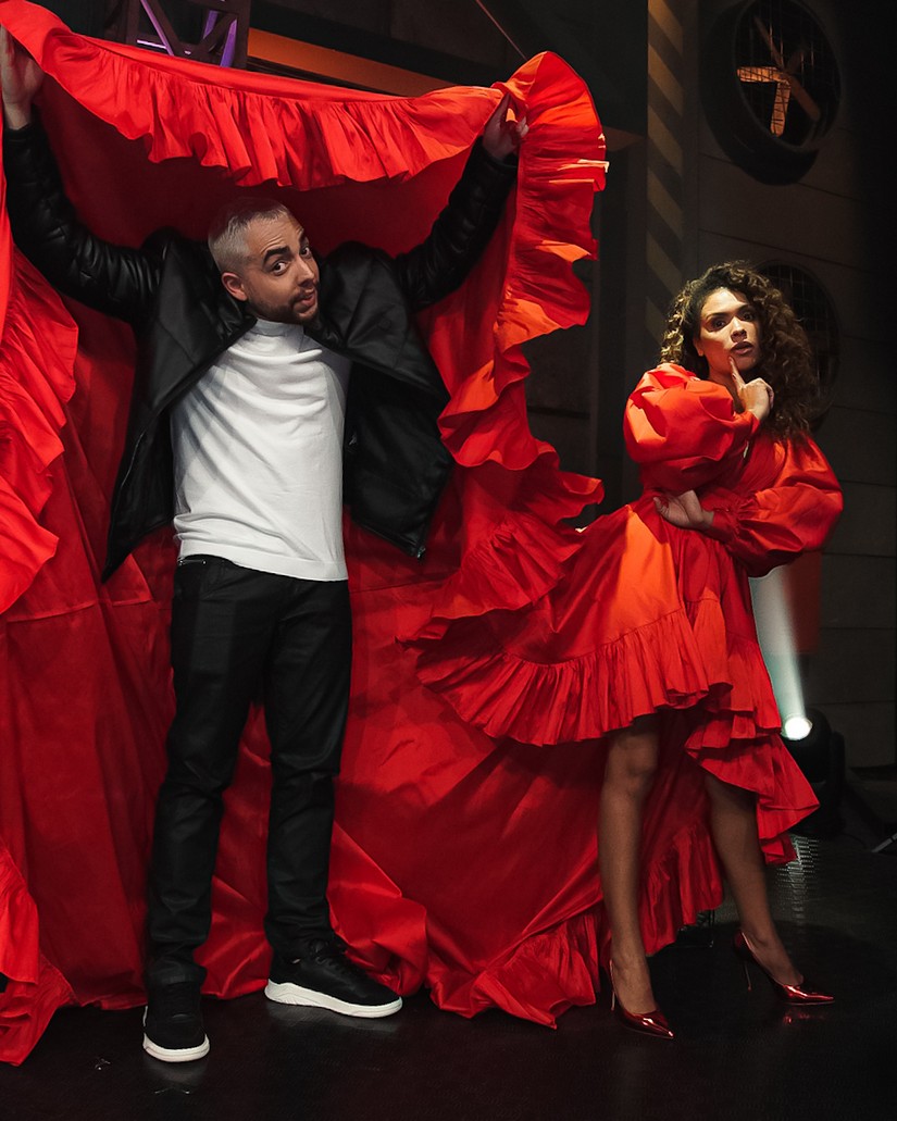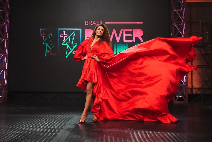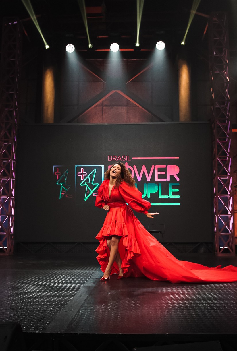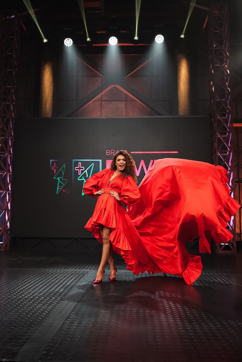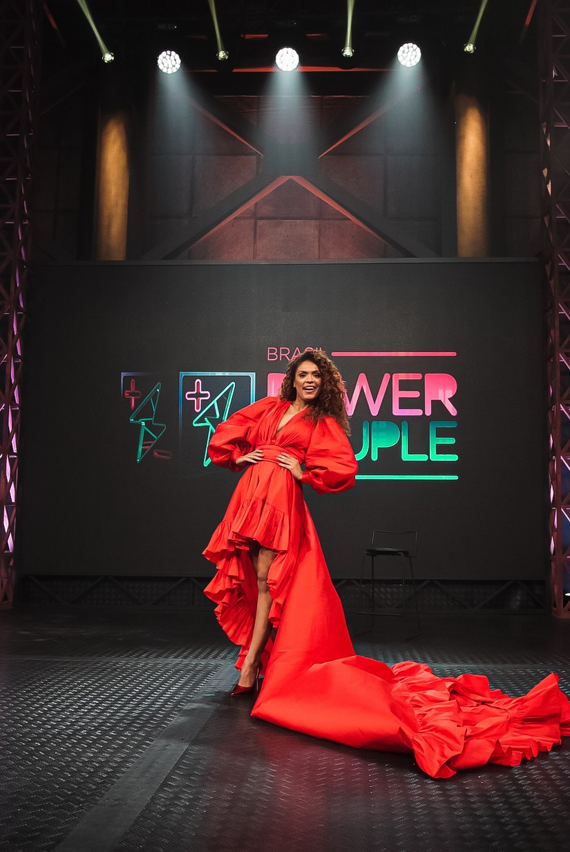O vestido vermelho de mangas bufantes e calda de três metros veio com exclusividade do ateliê Lucilia Ribeiro diretamente para compor o figurino de Lidi Lisboa que, ao lado de Lucas Selfie, protagonizou os primeiros momentos do reality com maestria.