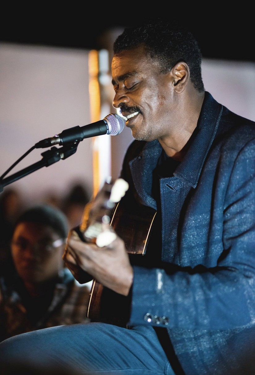 Seu Jorge cantou num espaço, no meio dos convidados, no terceiro andar da casa que tem uma vista deslumbrante o mar de São Conrado. Ele fez duas apresentações durante a noite emocionando a plateia cantando sambas antigos e clássicos da MPB, Retrato em Preto e Branco, de Tom Jobim, na voz dele é divino! Aliás, o que não fica divino na voz abençoada de Seu Jorge? O “ponto alto do show” foi quando ele cantou “Felicidade”. Tudo mundo cantou junto…