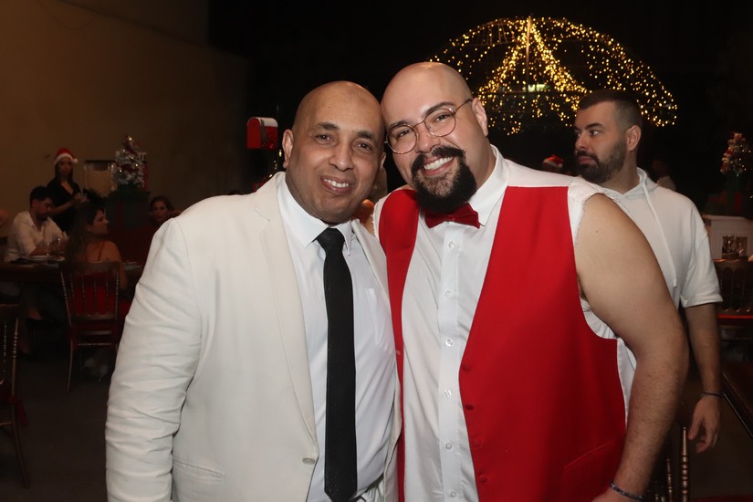 No salão, mesas e cadeiras douradas cobertas de toalhas com motivos natalinos e arranjos de Natal nos tons de dourado, verde e vermelho. No pátio externo coberto, mais mesas e o grande destaque vai para belíssima mesa de doces e chocolates com mais de 6.000 gostosuras! Em outra mesa, ficava o bufê com comida de Natal. Peru, tartar de salmão, queijos, presunto de parma, ravióli de brie com nozes, entre outras delícias, e a controversa farofa com passas. Uns gostam, outros não. Eu adoro. E já dizia minha saudosa mãezinha, “quem não gostar, que coma menos.” Sábias palavras… Estava tudo maravilhoso. Serviço de open bar, da Brazen Bar, e garçons irrepreensíveis.