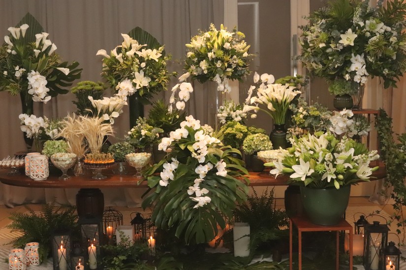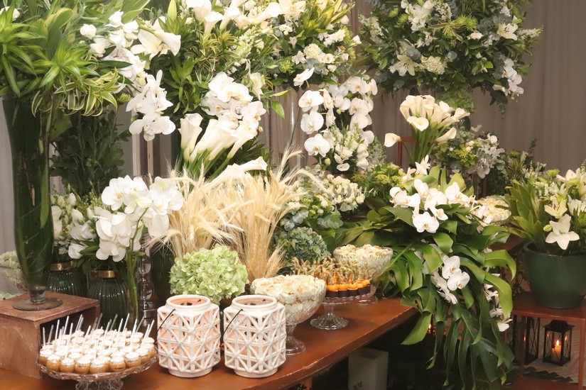 O espaço da festa foi dividido em vários ambientes. Todos interligados. Na entrada, à direita, havia uma sala com a mesa de doces deliciosos assinados por Giuliana Pimenta, além do bolo e o café para o final da noite. Um grande open bar, ao lado da movimentava pista de dança, ilha de comidinhas deliciosas, grandes lounges no pátio externo e no interno, onde também havia outro open bar e mais um bufê de comidinhas.