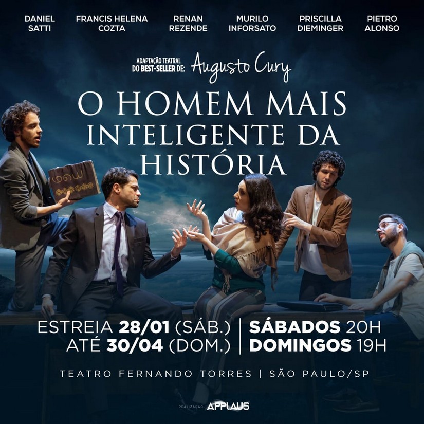 Daniel Satti volta aos palcos paulistas com ‘O Homem Mais Inteligente da História’. Sucesso, a peça é uma adaptação do livro homônimo do psiquiatra e escritor best-seller Augusto Cury, escrita junto a Francis Helena Cozta e com direção de Ivan Parente. O espetáculo faz temporada de 28 de janeiro a 30 de abril, no Teatro Fernando Torres (SP), com sessões aos sábados às 20h e domingos às 19h.