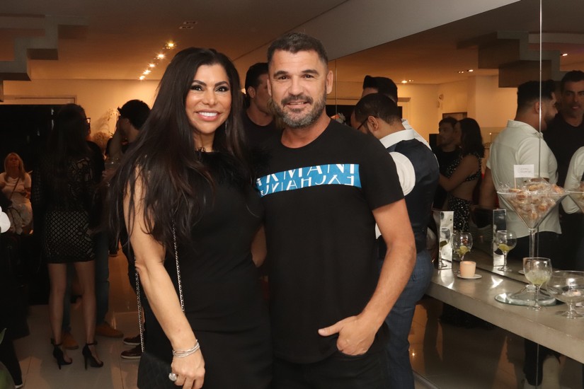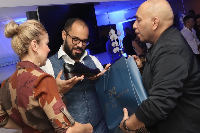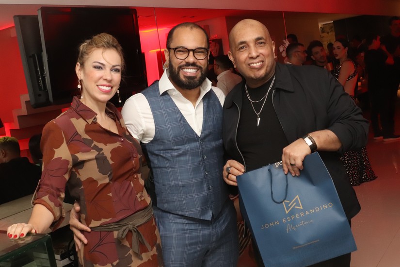 Ainda estavam o alfaiate queridinho dos ricos e famosos e bem vestidos, John Esperandino e sua elegante amada Elaine. John comemorou recentemente 39 anos de vida e 9 de sua alfaiataria numa super festa que registramos. Me presenteou com um sapato lindo da sua marca. Amei! Macio, confortável, parece que nem fala português o sapato do John… Imaginem então os belos ternos e sua linha de roupas? Alerta de spoiler: os produtos dele já estão quase, quase, pousando em outros países. Wow!