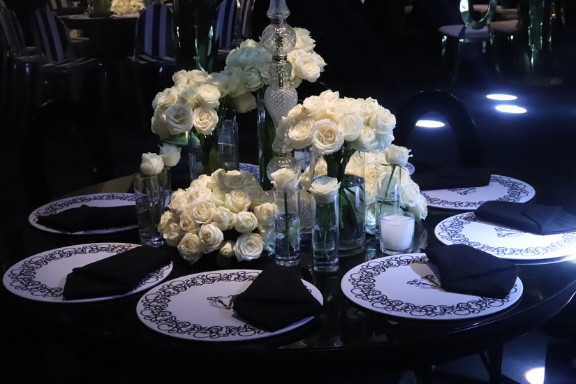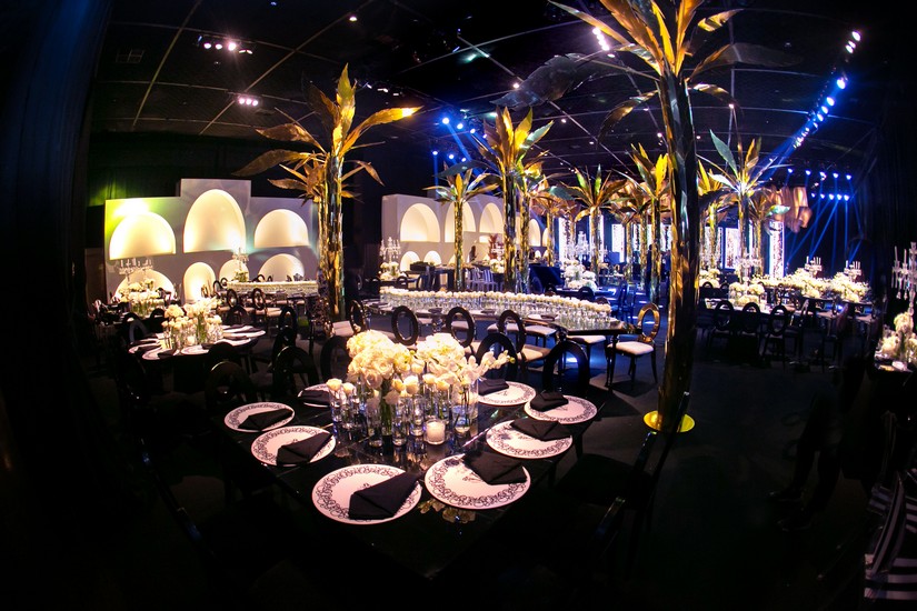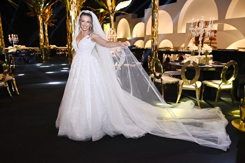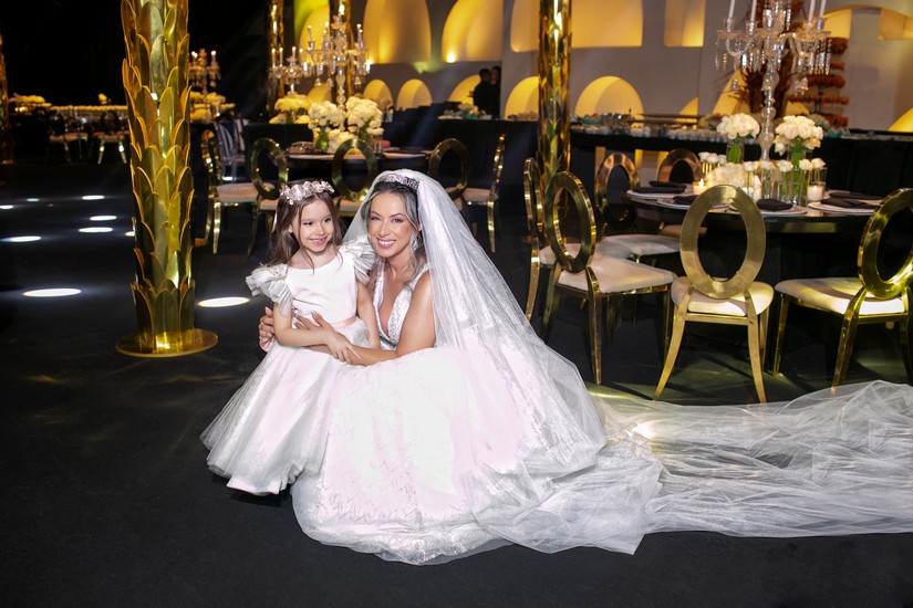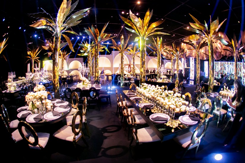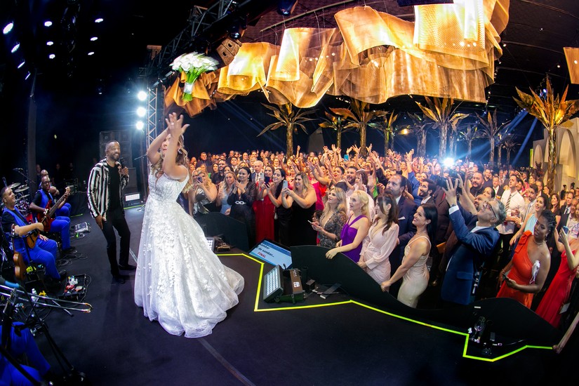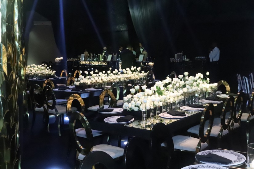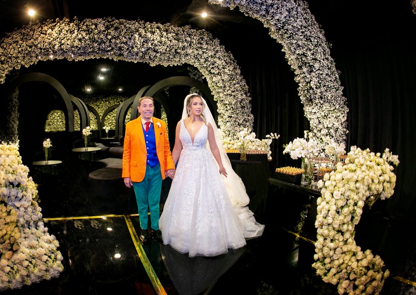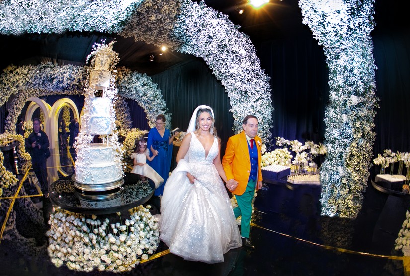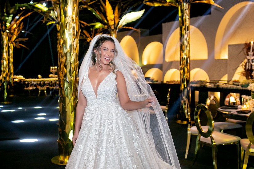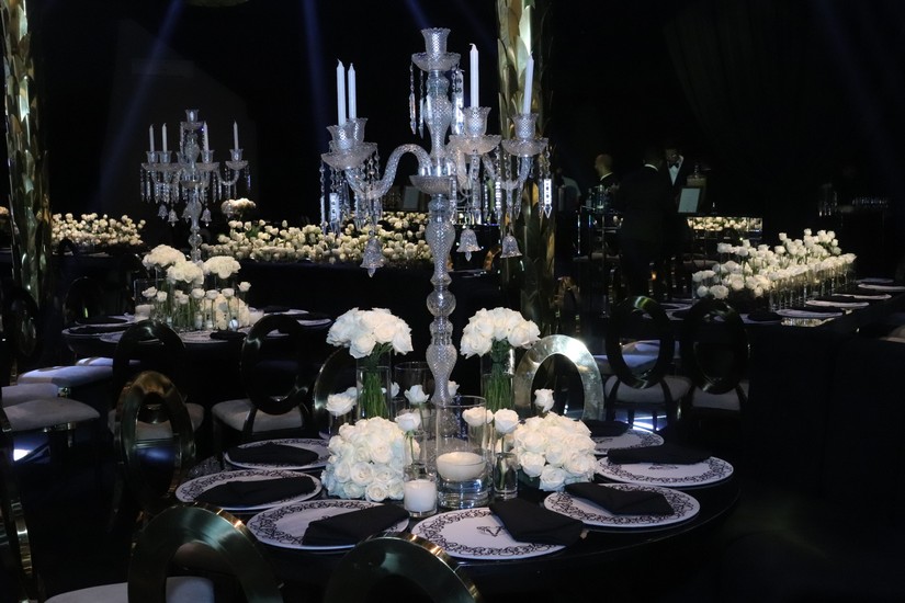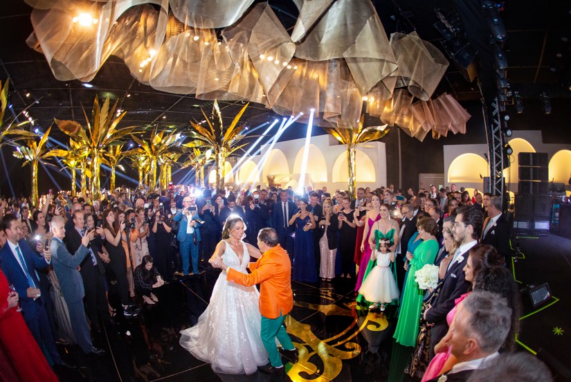 Se até aquele momento tudo surpreendia, havia muito mais pela frente! Mantendo a harmonia, o salão principal também era todo preto, chão e paredes, porém, fomos impactados por 15 palmeiras de metal dourado espalhadas pelo salão, realçadas por uma iluminação especial. As mesas, redondas e em formato de “S” ganharam arranjos sofisticados e detalhes como os sousplats e guardanapos personalizados com o monograma GV em branco e preto. Todos os salões foram decorados com uma profusão de flores brancas. Um luxo. Aos poucos, os convidados foram chegando e lotando o salão. Não demorou muito para Geisi e Valdecir entrarem para fazerem seus agradecimentos e abrirem a pista com uma tradicional valsa. Teve ainda uma coreografia das madrinhas, comandada por Geisi.
