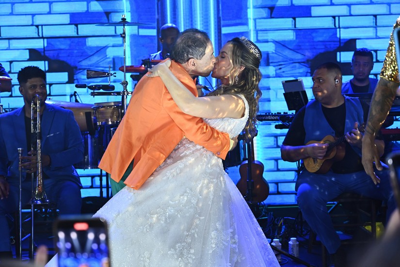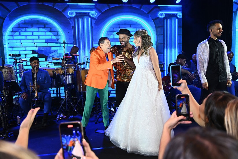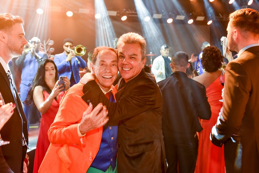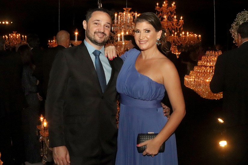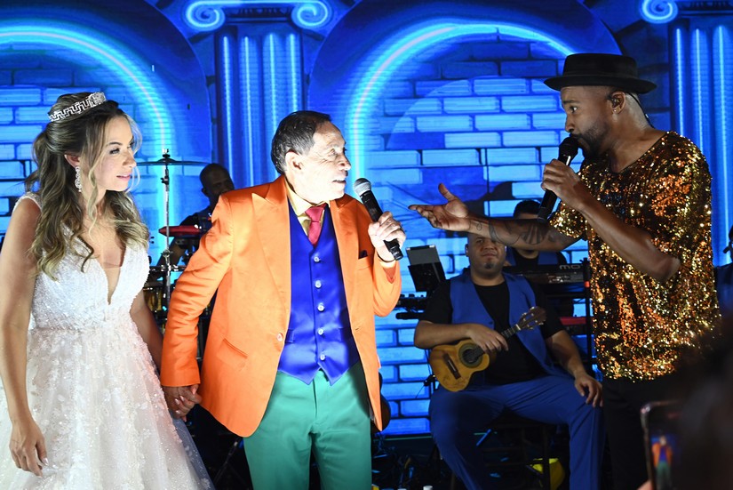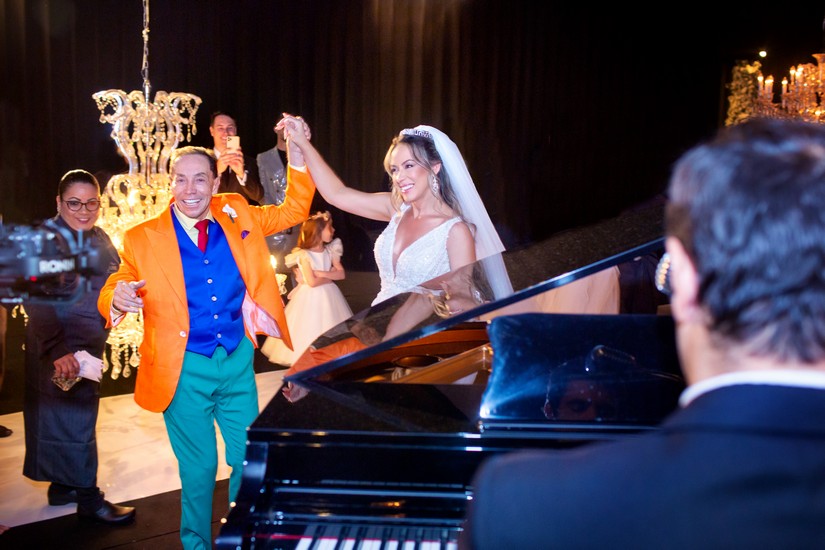 Após a cerimônia, o casal partiu para o cerimonial Le Buffet Master para festejar com os convidados. E se Valdecir surpreendeu com o traje, muitas surpresas estariam por vir. A começar com um novo salão montado especialmente para a noite, na rua. Piso vinílico, refrigerado, repleto de flores brancas, onde estava o bolo e mesas de doces. Mas antes, ao chegarem, os convidados foram direcionados a um outro salão para o receptivo com paredes e chão preto com vários lustres de cristais enormes, em posições diferenciadas e alguns chegavam perto do chão, outros à meia altura e outros no teto. Neles, guirlandas grossas de flores proporcionaram um visual extremamente elegante. Ali, com música de piano, brindes de champagne Perrier Jouet, vinho tinto Memorias e El Principal, uísque Dimple 15 anos e canapés de salmão, camarões enormes e lagosta. São as facilidades de morar na ilha de Vitória onde essas iguarias são fáceis de encontrar.