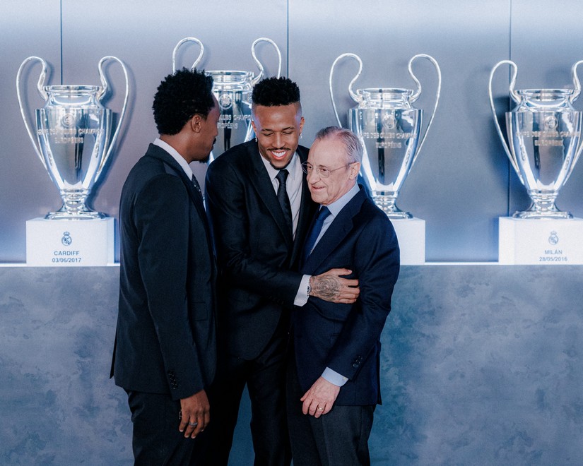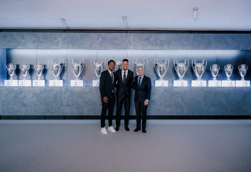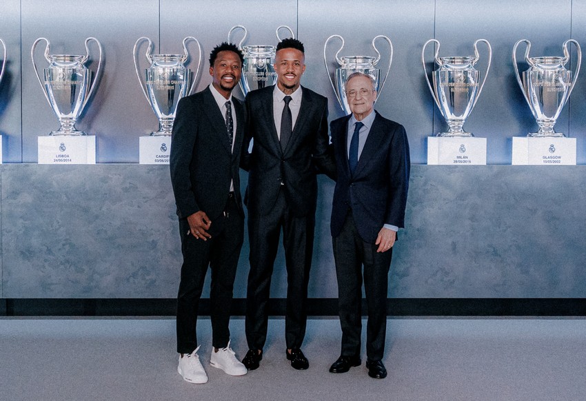 O jogador Éder Militão - na foto com seu agente Ulisses Jorge e o presidente do Real Madri, Florentino Perez - renovou contrato com o clube. O novo vínculo vai até junho de 2028, três anos além do que previa o acordo anterior, assinado quando chegou ao Santiago Bernabéu. O anúncio da renovação do zagueiro brasileiro de 26 anos foi feito pelo clube espanhol nesta terça-feira, 23/01. De acordo com a imprensa espanhola, ele passará a receber cerca de 6 milhões de euros (R$ 32 milhões) por temporada.