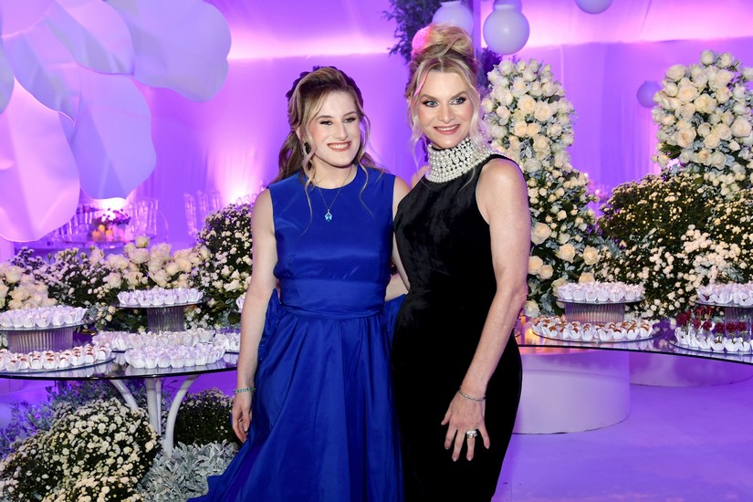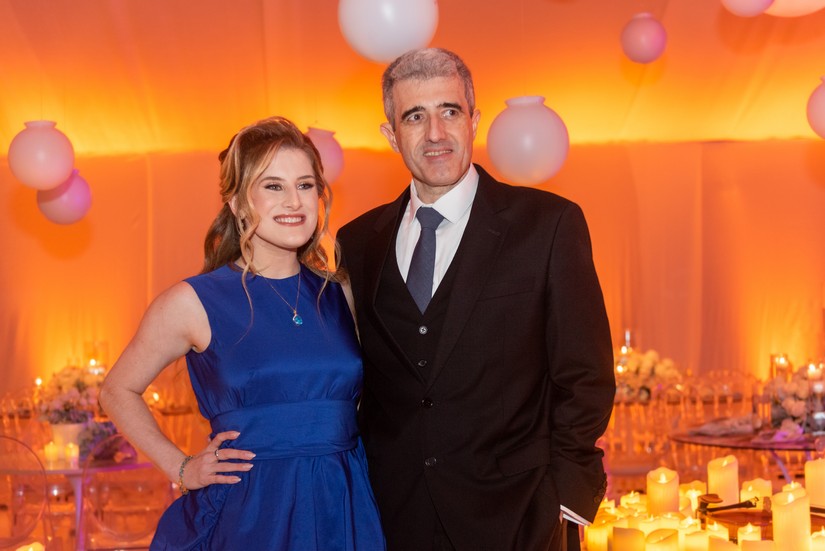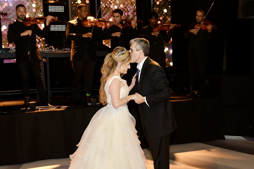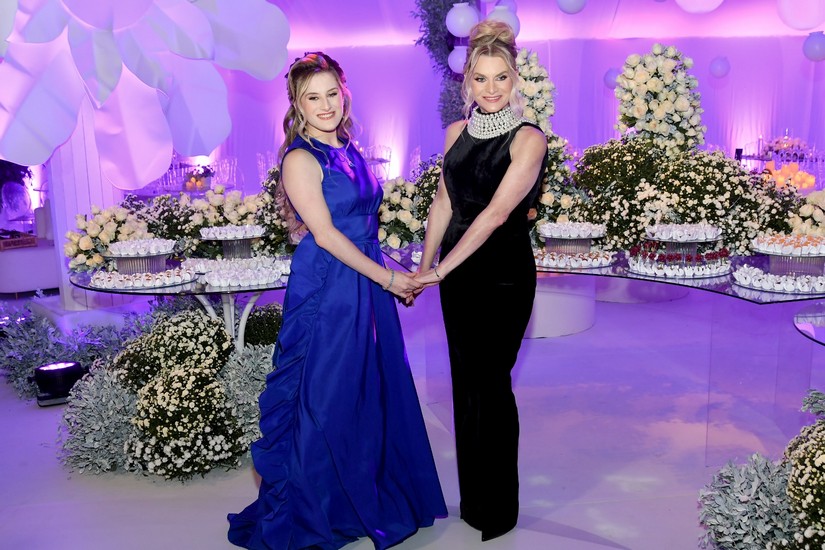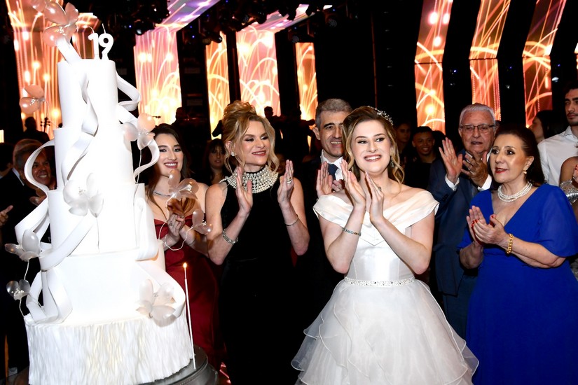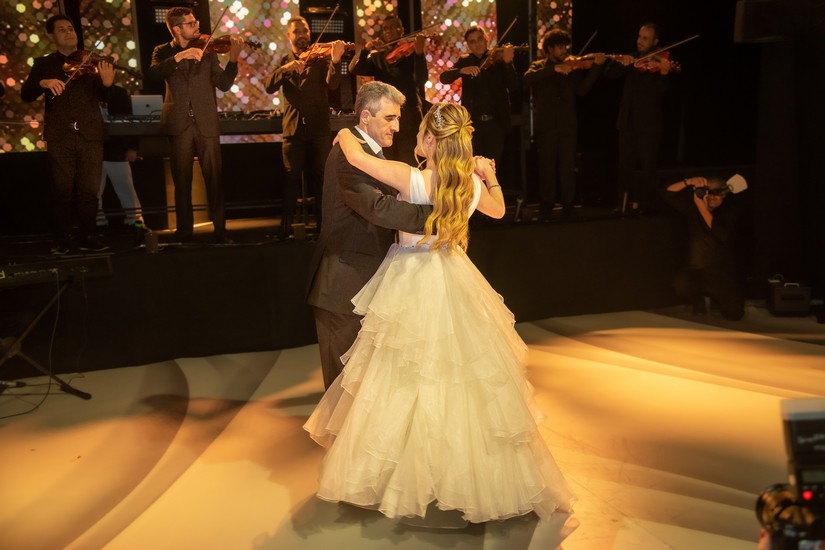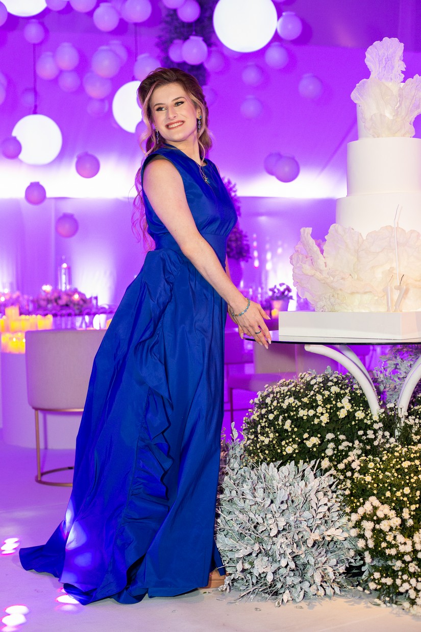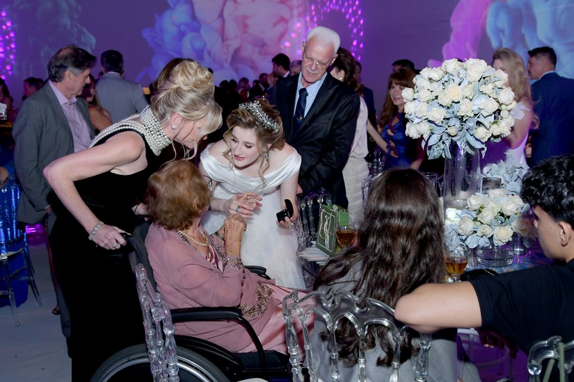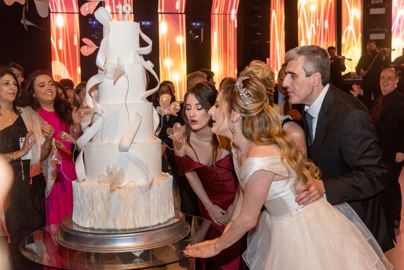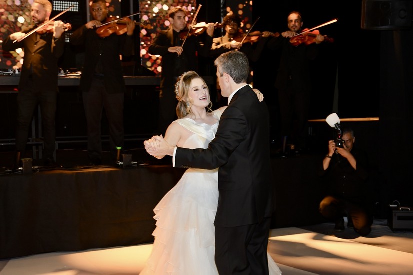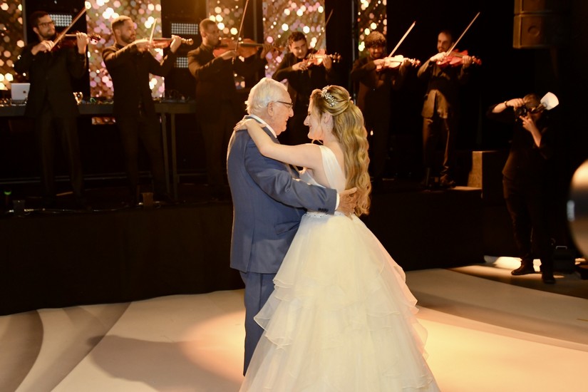 Após receber os convidados, Juliana, que mostrou doçura e gentileza com todos que chegavam, foi se preparar para dois momentos muito especiais da noite. O primeiro, o de Juliana cantando “Aleluia” com imagens projetadas em sua saia cenográfica (vocês irão entender já já). O outro momento, foram as valsas com o pai, Fábio, e em seguida com o avô paterno, Natalino Littig. Que emoção! E teve parabéns para Juliana e parabéns surpresa para o pai que faria aniversário dois dias depois da festa.