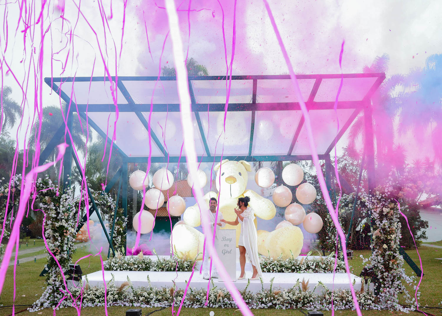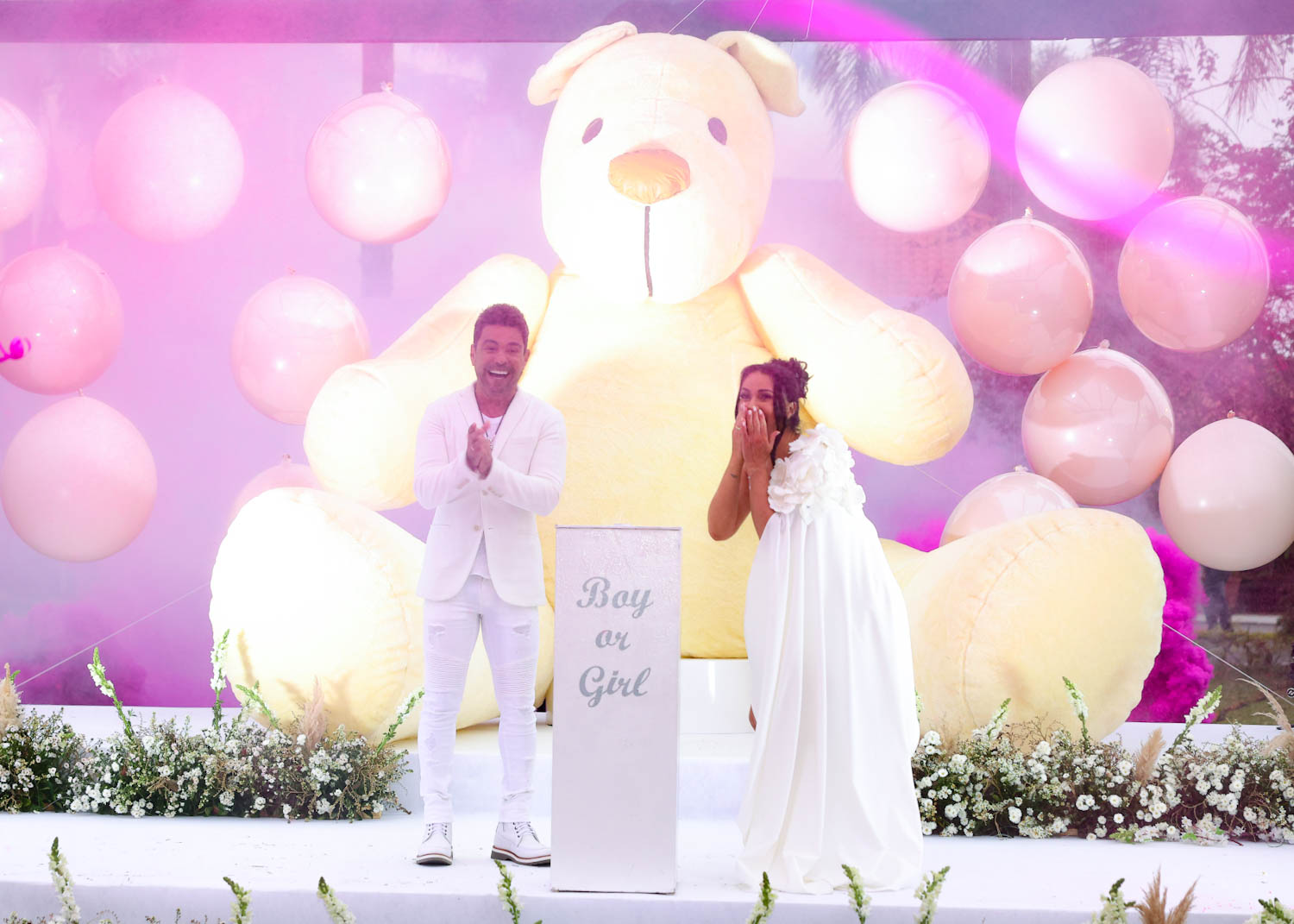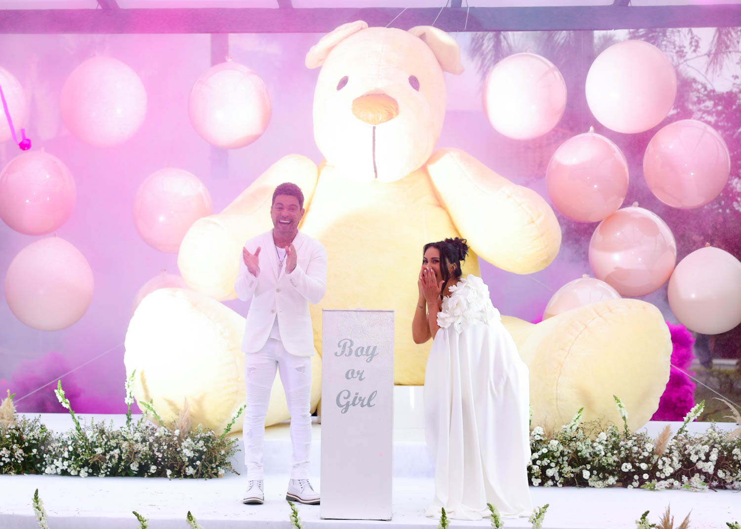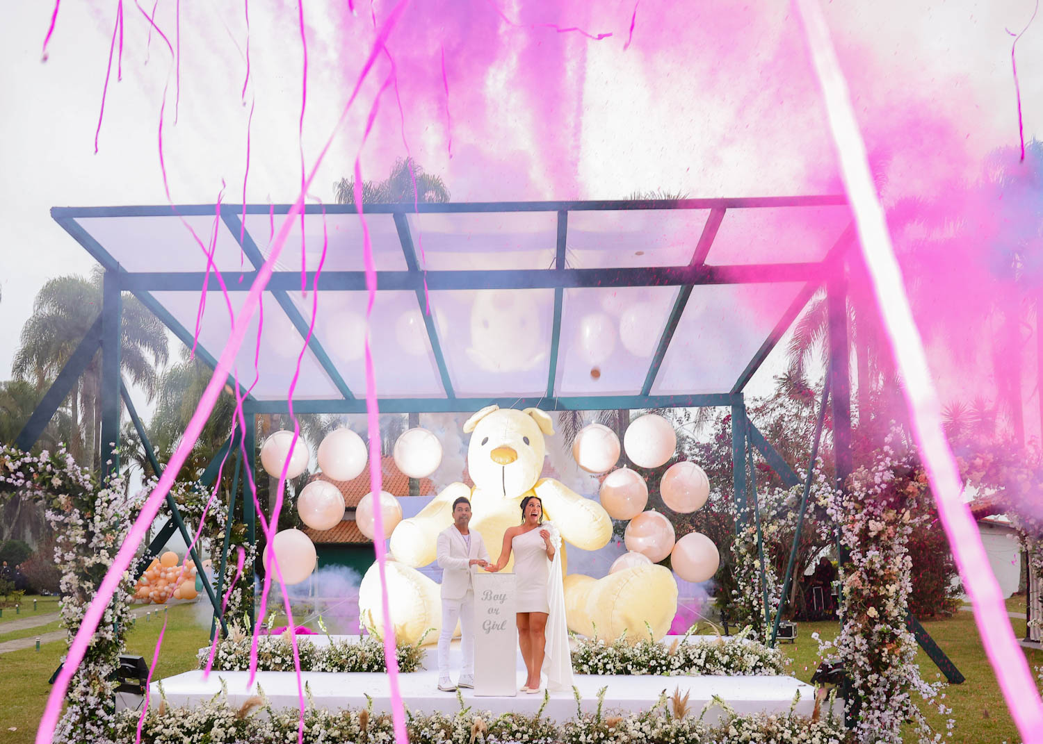 Assim que uma fumaça rosa foi liberada indicando o sexo do bebê, os dois celebraram a chegada de Clara e, na sequência, o cantor pediu para que os convidados permanecessem no local.