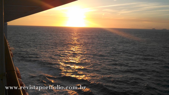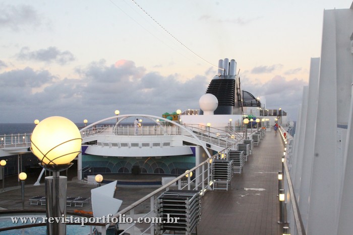 Após acomodados nas cabines, curtimos a saída do Rio de Janeiro tomando um champã na varanda, com a bela vista das praias da zona sul carioca. Depois, subimos para o deck das piscinas para curtir a chegada da primeira noite. Enquanto eu e Giovanni bebericávamos uns drinks, João Alberto, João Paulo e Antonio, já estavam explorando o navio. As equipes de atendimento e de recreação da piscina são nota 10. São de muitas nacionalidades, mas, a comunicação flui bem e a diversão é garantida.