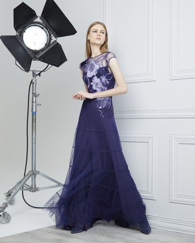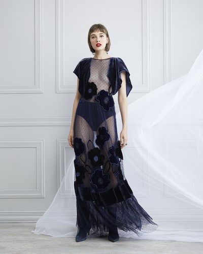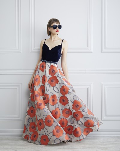 Com destaque para a papoula gigante – flor do extremo oriente – bordada à mão e sobreposta em tules, seda Chanel e jacquard italiano, na sua maioria em brocados suavemente metalizados.