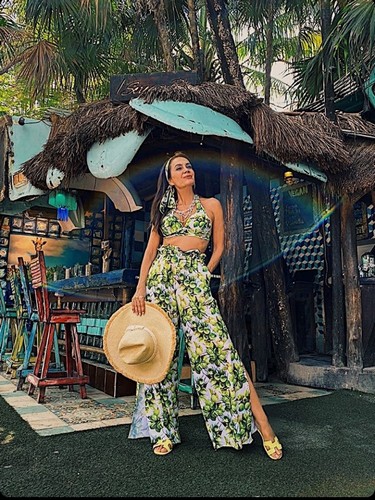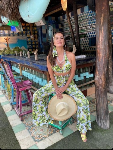 Com calça clochard e top com estampa cheia de brasilidade e importante proteção UV da UV Beach, Claudia Métne desbravou a praia e a cidade que possui um importante sítio arqueológico e histórico.