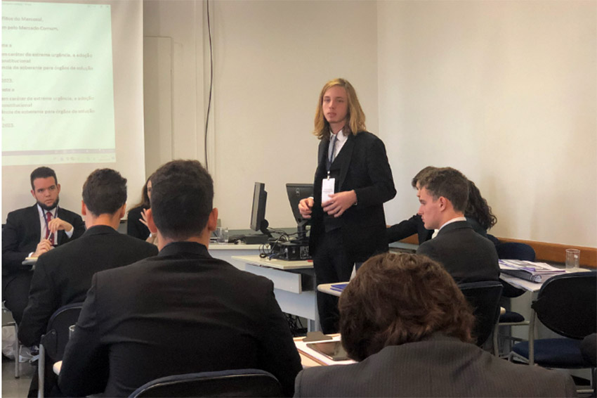 João Flávio Gomes Figueiredo ao lado de Mateus de Castro Del’Esposti Mazzoco, representando a Argentina, foram eleitos Melhores Delegados no Comitê Mercosul. João Flávio comenta: “Participar de um fórum é sempre uma caixinha de surpresas. Você está se preparando para um debate sobre um determinado tema e nunca tem plena certeza do que pode encontrar. Pode ser que você lide com delegações dispostas a cooperar e negociar com bom conhecimento do tema, ou que haja delegados hostis à sua posição e com todos os argumentos possíveis para refutá-lo. E é dessa expectativa que nasce uma das maiores virtudes do fórum: o estudo autônomo. O participante não recebe uma cartilha com os conteúdos específicos que serão passados por um professor e mastigados em diversos níveis; ao invés, recebe um mote do qual surgirão inúmeras possibilidades de aprofundamento (o céu é o limite, mas ficar no chão é possível), inúmeros caminhos de pesquisa espalhados por diversos sites com informações verdadeiras e falsas e, no meio do caminho, virão dúvidas que nem seu professor conseguirá responder, apenas o participante com todo conhecimento acumulado até então. Ao contrário da rotina escolar, o fórum é a verdadeira produção de conhecimento, o verdadeiro teste da capacidade do aluno conectar informações, produzir argumentos sólidos e expô-los. Daí, advém a importância do fórum para os participantes como uma aproximação da produção no mundo académico e de saber lidar com o inesperado (tomando isso como incentivo para ser o MMC e não o MDC de saber do seu comitê)”.