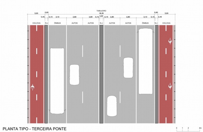 Além da ciclovia, a Terceira Ponte ganhará mais uma faixa em cada sentido, ficando com seis faixas no total. Assim, a capacidade de fluxo de veículos na ponte será aumentada em torno 40%. Hoje, a ponte possui quatro pistas, sendo duas para cada sentido.