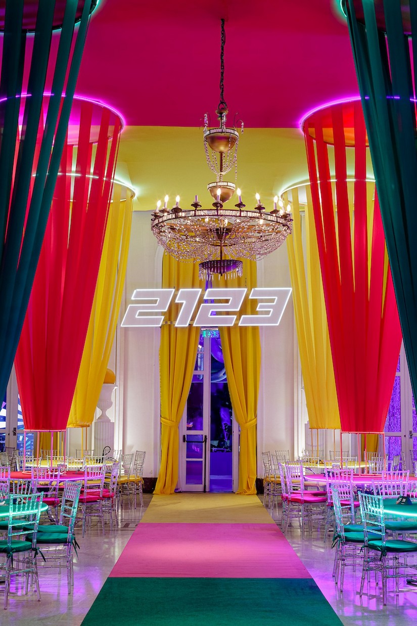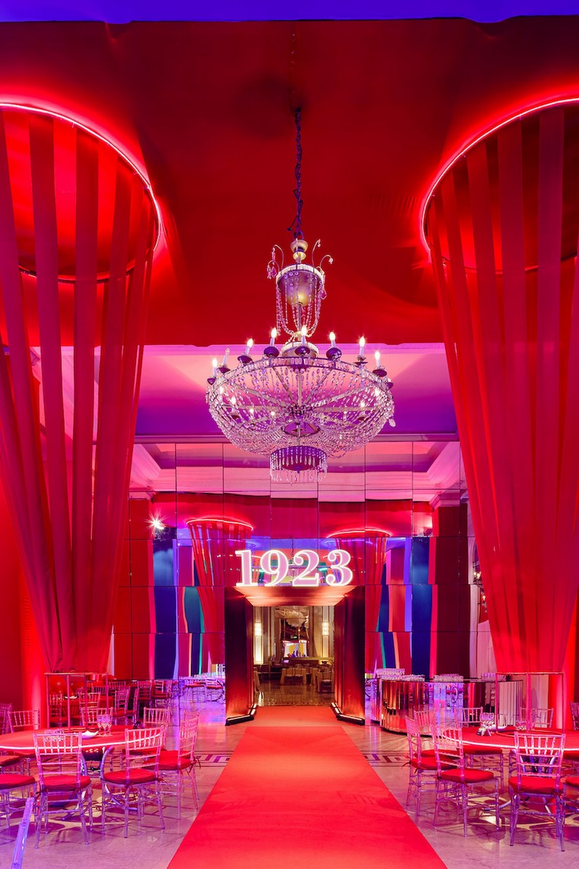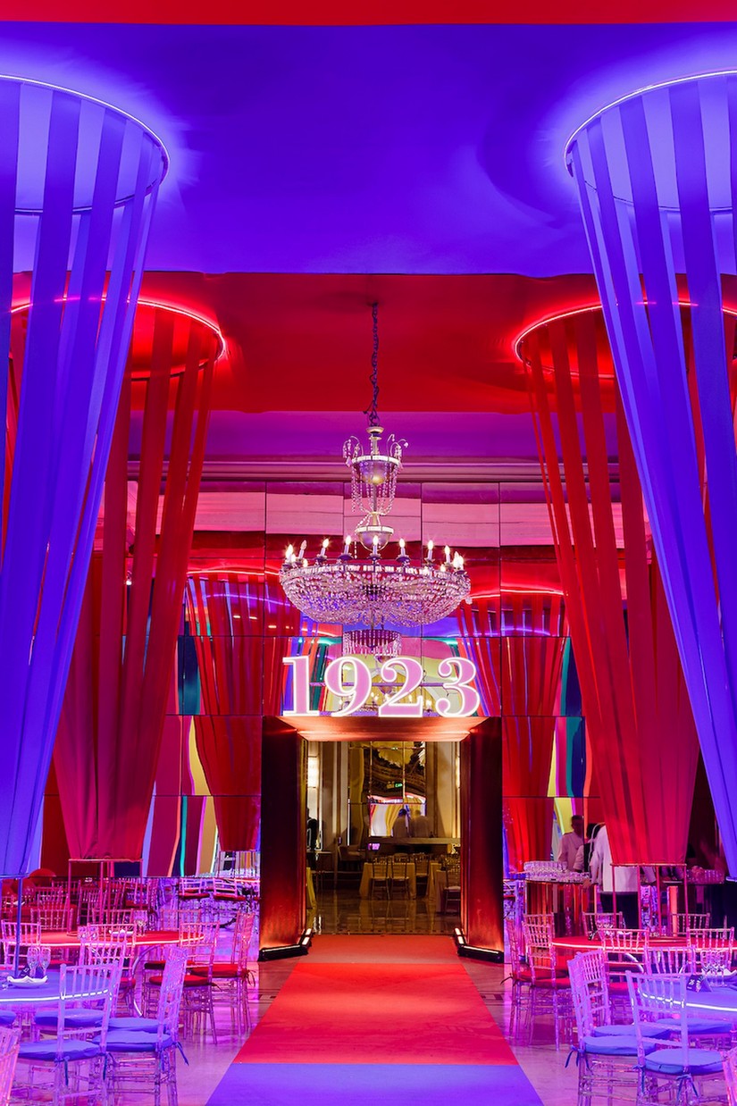 A decoração do evento teve elementos de 1923, ano de inauguração do hotel, e outras referências atuais, além de uma alusão aos próximos 100 anos a partir de formas, cores e estéticas que esperamos ver no ano de 2123. A entrada do evento, que foi pelo lobby, e os corredores, receberão uma Op Art - arte em preto e branco e espiral que representa a ilusão de ótica de um verdadeiro túnel do tempo. O preto e o branco remetem imediatamente a antigos programas de TVs e filmes, criando uma atmosfera retrô estonteante.