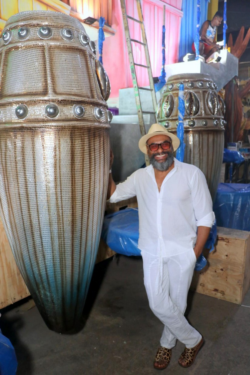 No último carro da Escola, Cahê Rodrigues traz alguns artistas e personalidades de sucesso. Todos pretos. Entre eles, o estilista Hermes Inocencio, que representa ele mesmo no desfile.
